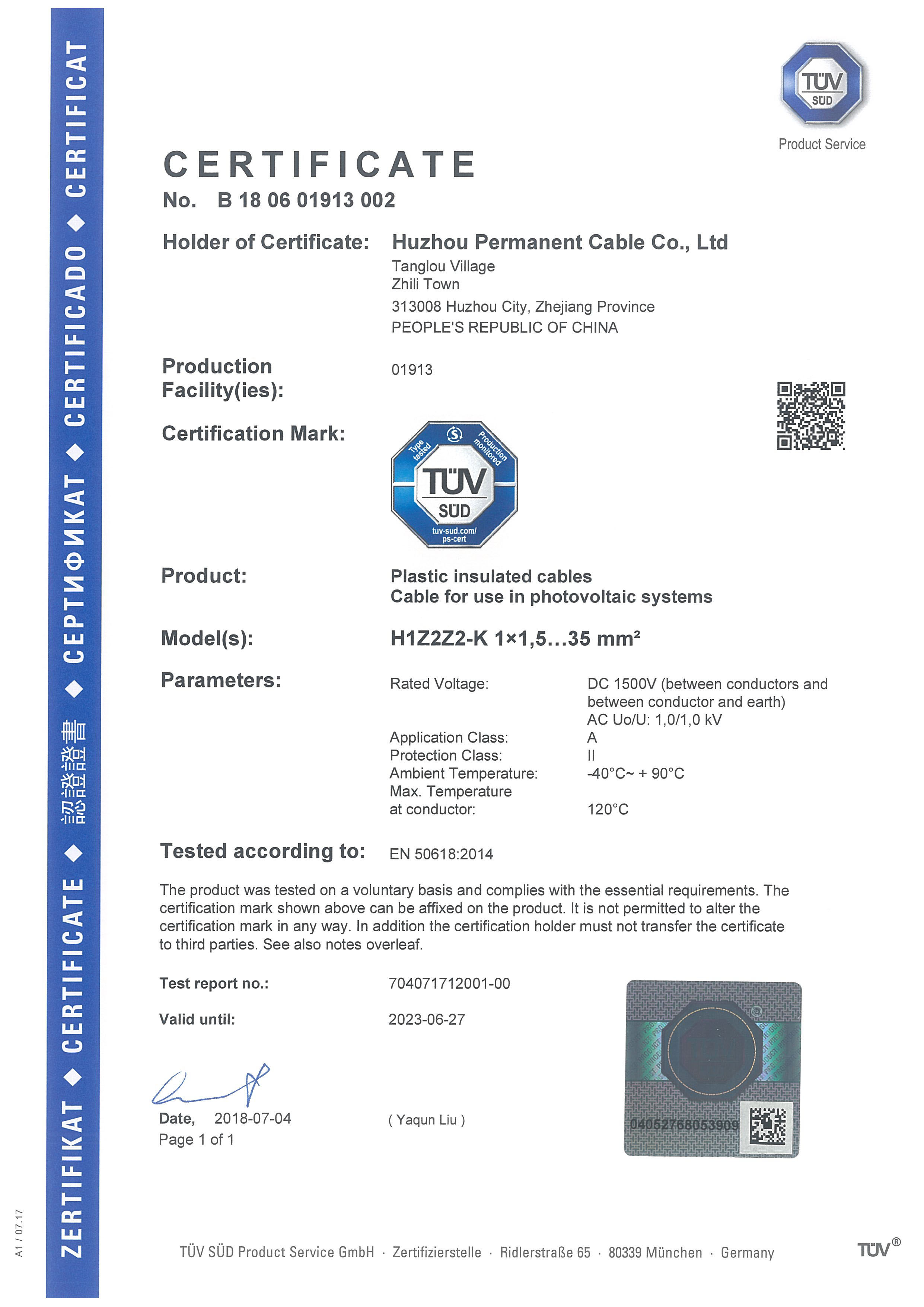 2016年--2018年,我司先后獲得了CE證書和TUV證書, 通過了SGS的第三方驗廠。2017年-2018年,2年的時間內,在新能源領域--光伏電纜, 取得了重大進步。